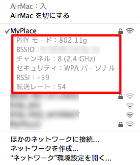 わたしは結構頻繁に,メニューバーのワイヤレスネットワークを示すアイコンをチェックするのですが,普通にクリックすると,どのアクセスポイントに繋がっているかが分かる程度なのに対して,optionキーを押しながら扇?のアイコンをクリックすると…
