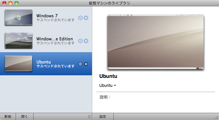 現在のVMware Fusion「仮想マシンのライブラリ」の状態